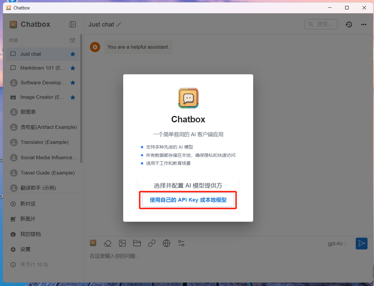 - 打开 Chatbox,点击“使用自己的 API Key 或本地模型”。